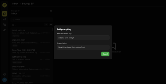 This will create a ticket in our system, and the prompt will be updated within 24 hours. Our team will reach out to confirm the change. For more urgent matters, please reach out to help@hostie.ai.